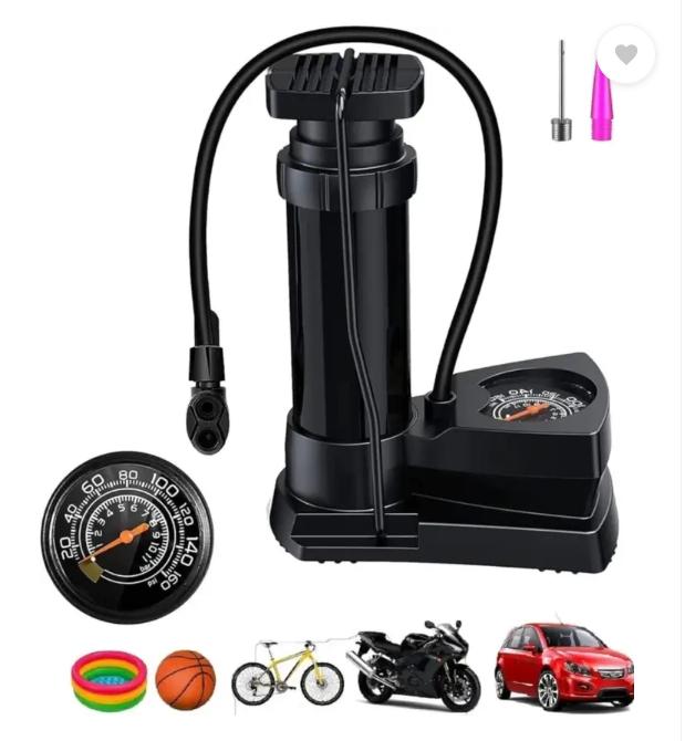 Portable mini bike pump or cycle pump operated by Foot and activated with pressure gauge. This is a portable mini air inflator which can be used to inflate tyres of cycles, bike cars, etc.